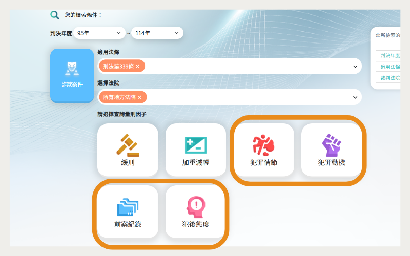 按確定後進入到「量刑因子」查詢介面。如下圖,加重事由是第2步,橘色框是第3步,但各個量刑因子的要件如果不確定,可不點選,直接進入查詢。查詢後即可看到「平均刑度」及「量刑區間」。